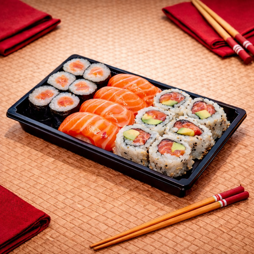 Box Mix Saumon Premium faite maison et fraîche, avec 4 nigiri saumon, 8 california saumon avocat et 8 maki saumon. Box sushi saumon faite maison sur riz vinaigré avec saumon frais et avocat fondant. La box mix saumon Premium idéale pour un repas japonais authentique.
